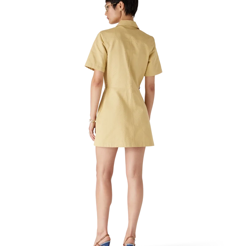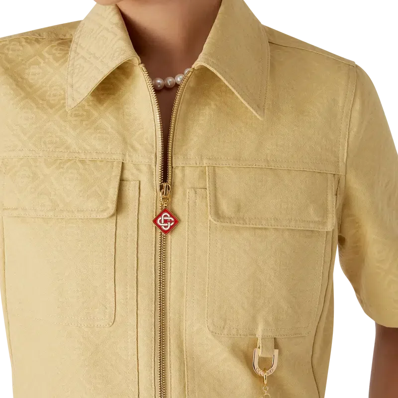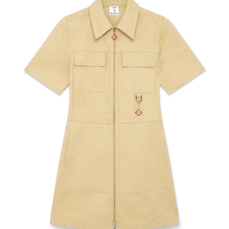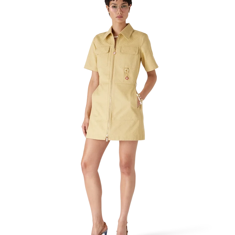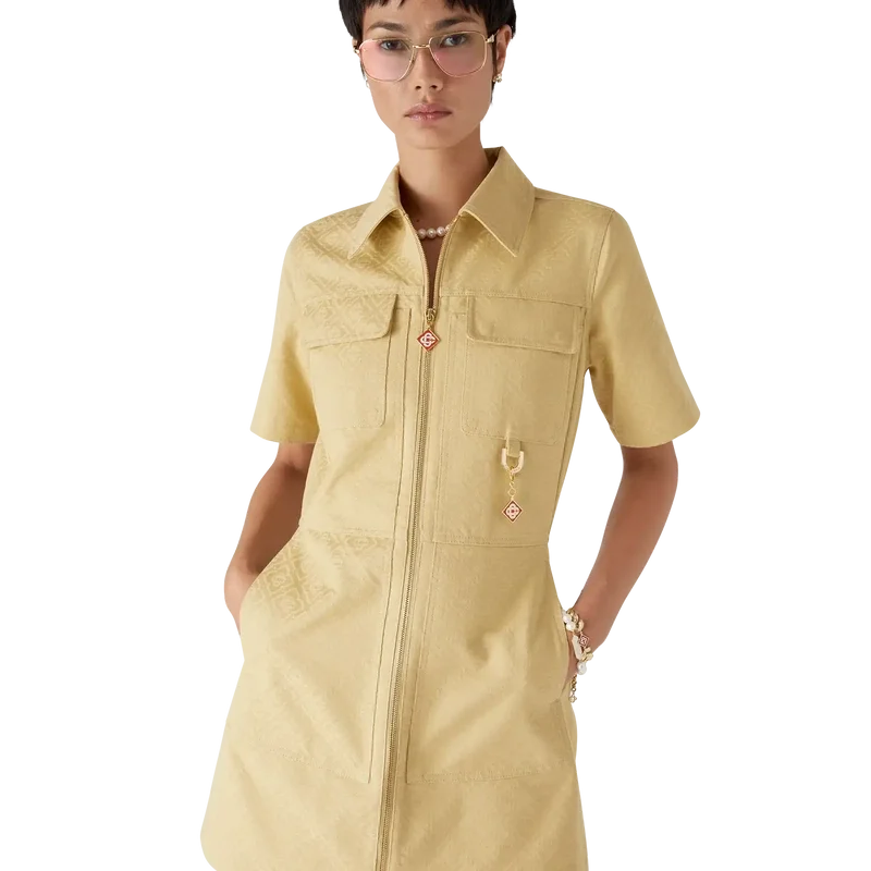 El vestido de jacquard de algodón con monograma es un minivestido de manga corta y corte en A confeccionado en tejido de jacquard de algodón con monograma. Se completa con cuello en punta, cierre frontal con cremallera que luce la lengüeta con el logotipo de diamantes característico de la casa, bolsillos de parche y bolsillos con solapa.