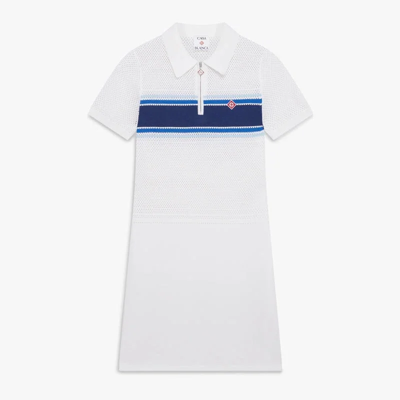 El vestido midi de malla a rayas blancas y azules es un diseño de punto refinado que presenta una raya azul que recorre el pecho y la espalda, con una elegante confección jacquard de rayas de malla. Se completa con un cuello clásico, cierre de cremallera, el logotipo de diamante característico de la casa, mangas cortas con puños acanalados y una silueta midi holgada.