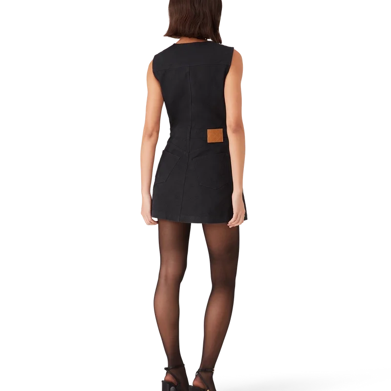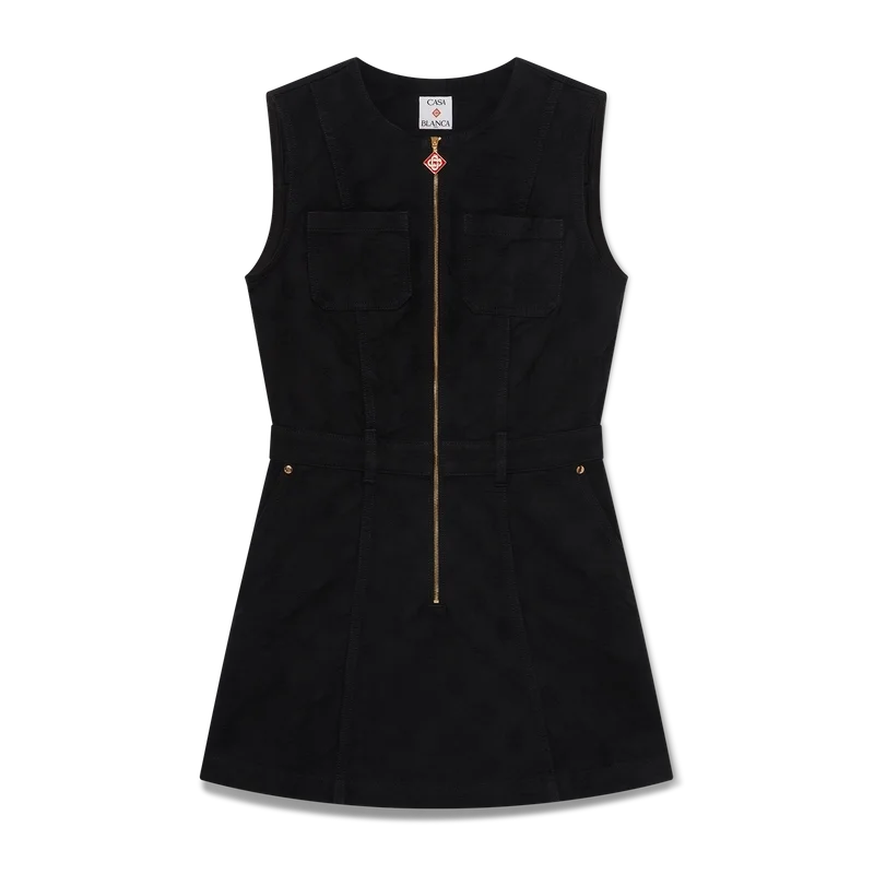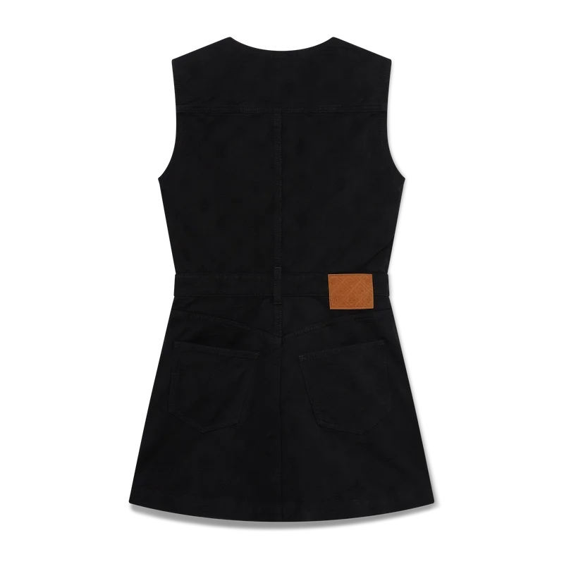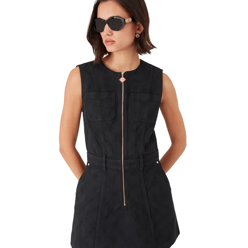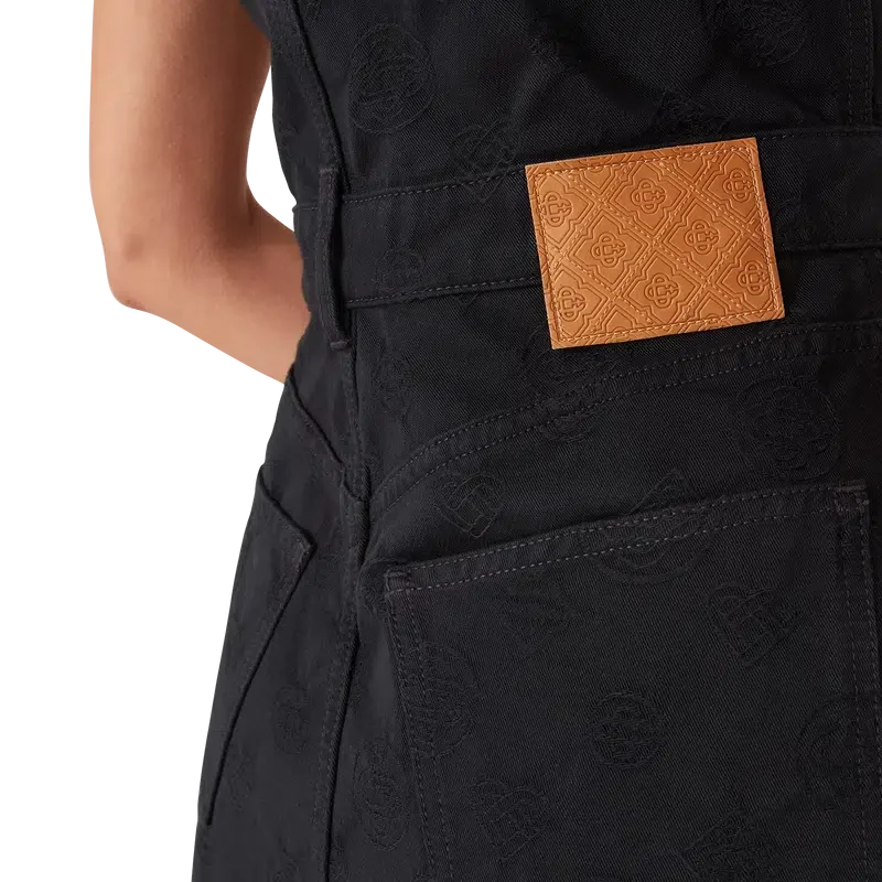 El vestido de denim con cremallera y monograma es un vestido sin mangas de corte mini y línea A, con el estampado del logotipo Honeydew de esta temporada. Este estampado se diferencia de nuestros otros monogramas, ya que combina formas únicas para crear un patrón cohesivo. Se trata más bien de un diseño basado en iconos.