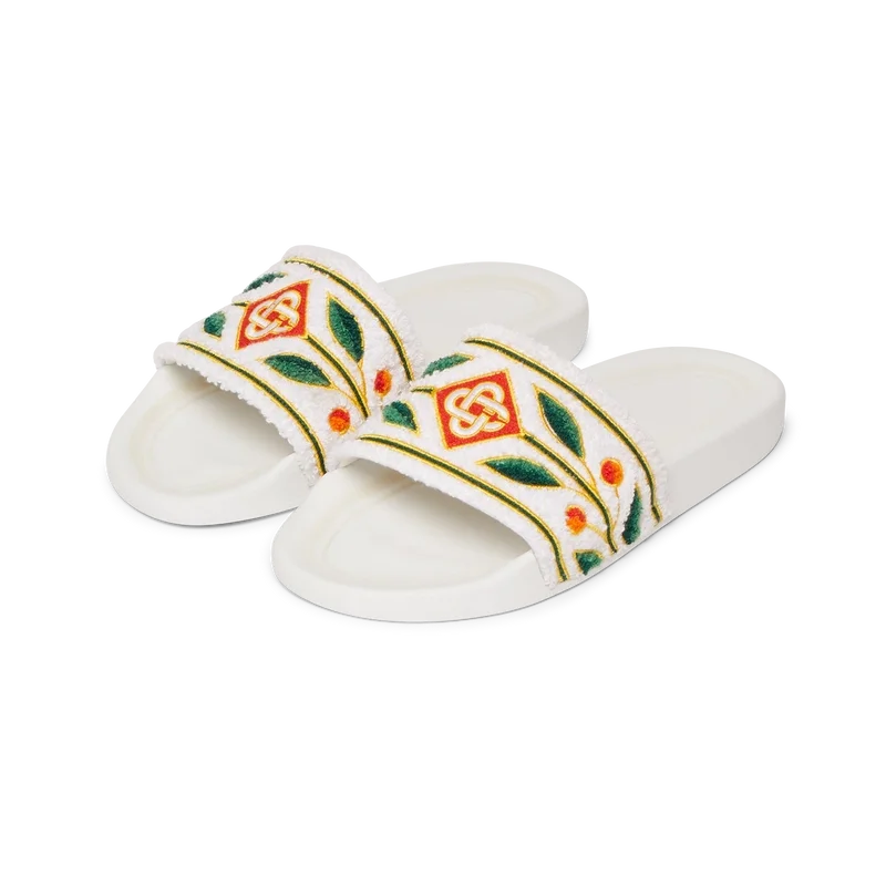 Las sandalias de felpa bordada lucen el logotipo del diamante de la casa y el diseño característico de la corona de laurel en la parte superior. Cuentan con una plantilla moldeada para una mayor comodidad y una suela de goma texturizada que combina rendimiento y estilo informal.