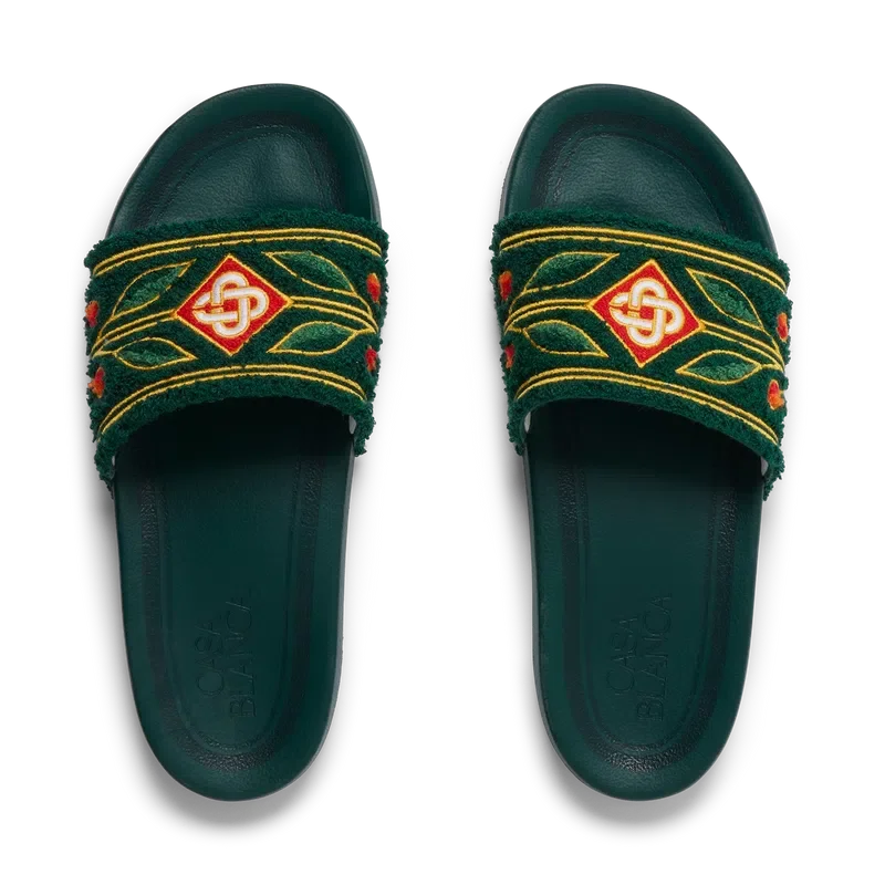 Las sandalias Laurel Terry están confeccionadas con tejido de rizo bordado y presentan el logotipo del diamante de la casa y el diseño característico de Laurel en la parte superior. Se completan con suelas acolchadas, blandas y flexibles, de aspecto similar al caucho.