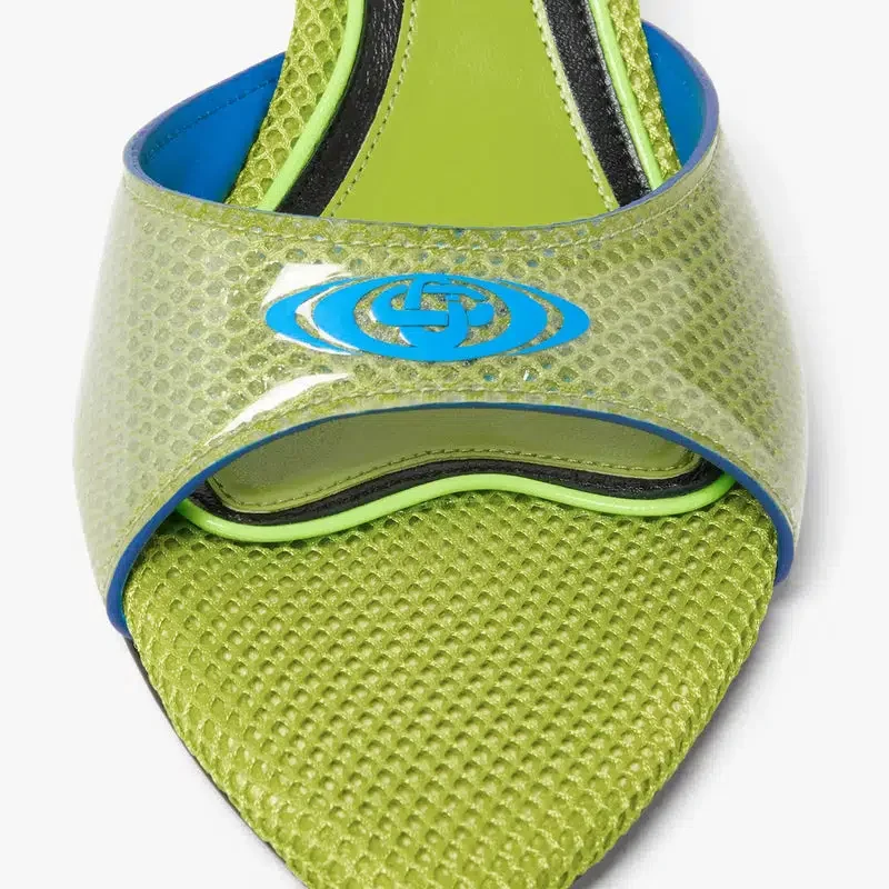 Las sandalias tipo mule con tacón verde presentan un refinado diseño sin talón ni tiras, con una elegante silueta de punta abierta. Se completan con el logotipo Warped de la casa en la parte superior y un elegante tacón bajo que encarna el enfoque sofisticado de la casa en cuanto al calzado de verano.