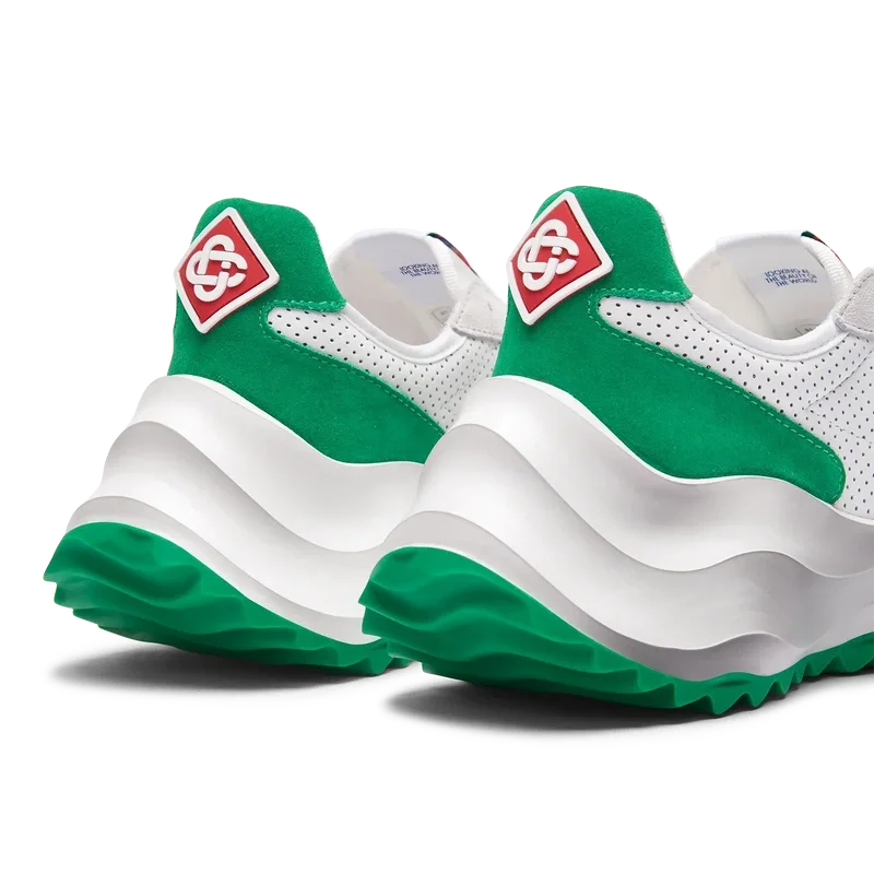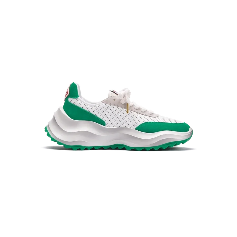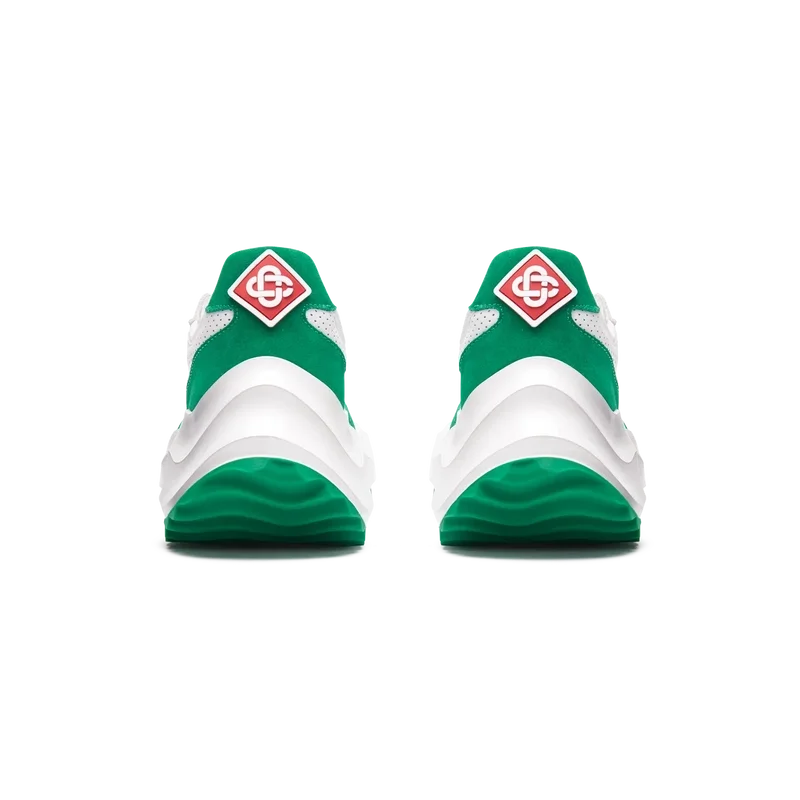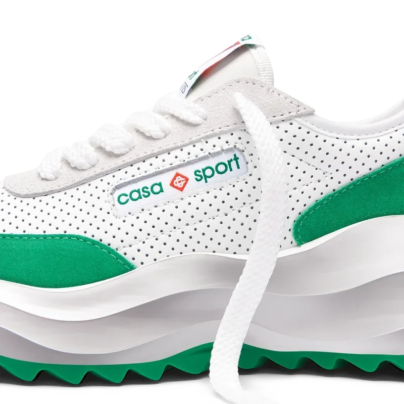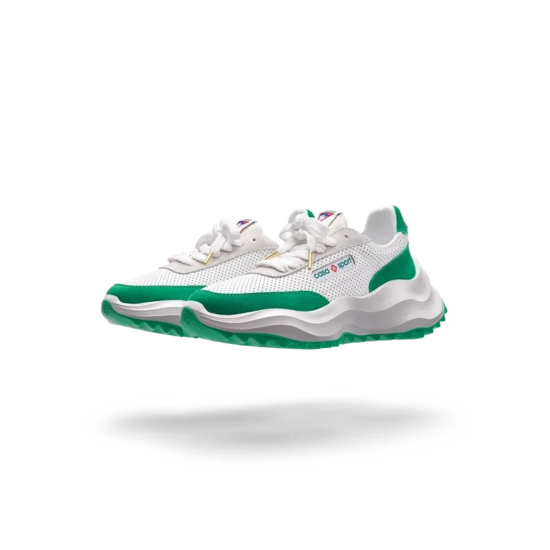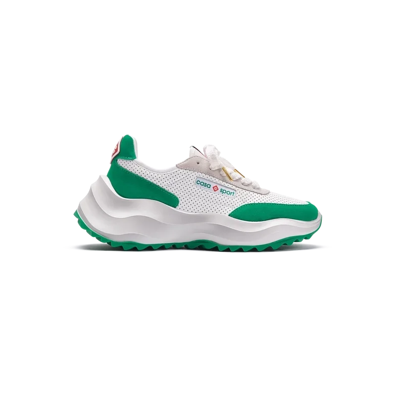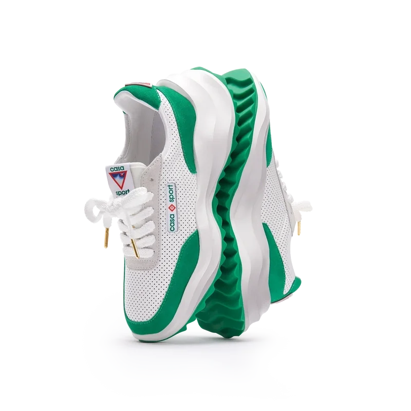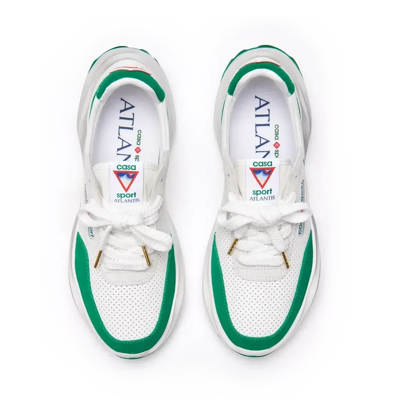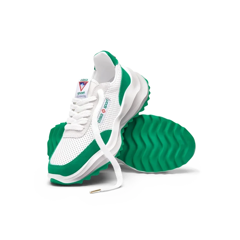 Verde tonalRevestimientos de ante, parte superior de cuero perforado, cordones de ante en contraste, parche de goma con el diamante de Casablanca en la lengüeta del talón, lengüeta lateral tejida con el logotipo de Casa Sport, etiqueta Atlantis tejida en la lengüeta, entresuela de EVA con relieve ondulado, suela exterior de goma, puntas de cordones doradas