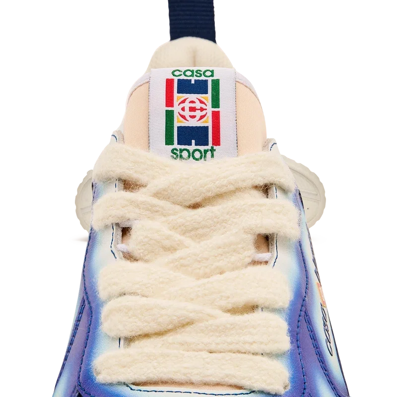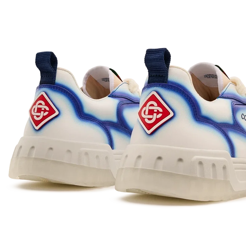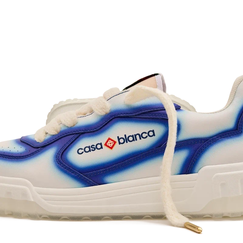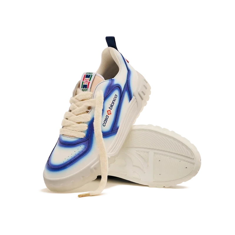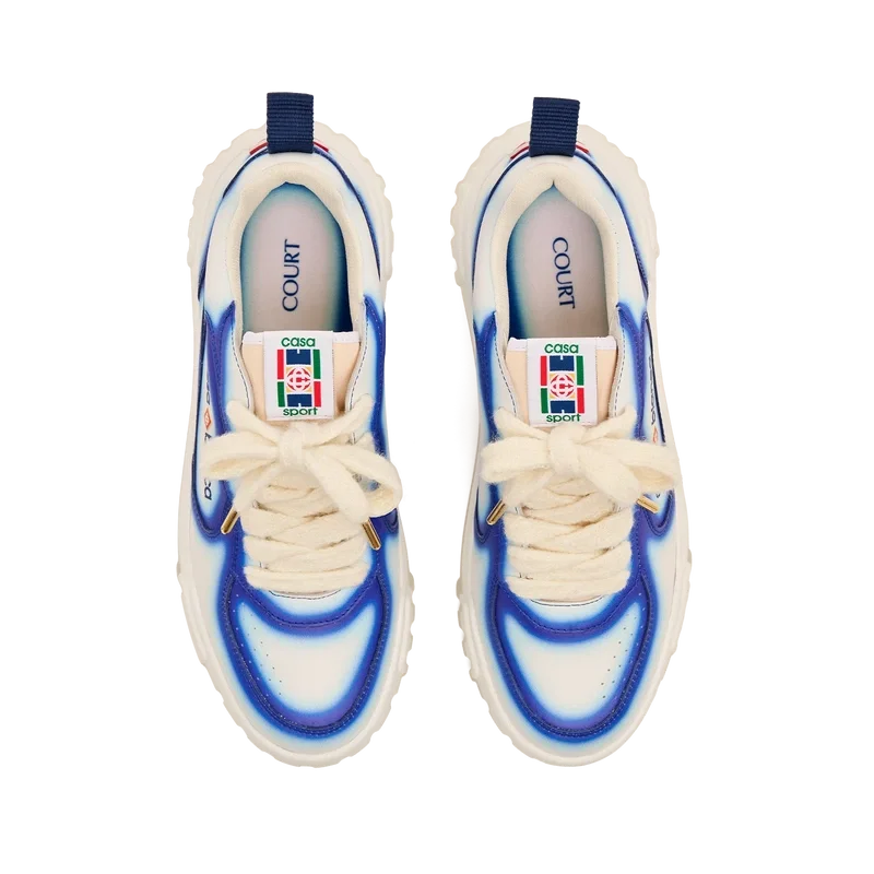 El lenguaje de diseño de las zapatillas Court refleja las siluetas icónicas de los años 90. Los colores que se aprecian en toda la suela de goma son una combinación de los códigos refinados del tenis y la arquitectura clásica, y crean una paleta unificada en toda la zapatilla, con el énfasis en los colores primarios contrastados por los blancos del tenis para crear una historia de colores con enfoque deportivo. La parte superior de los zapatos presenta líneas de paneles integradas y fluidas como un guiño a las siluetas icónicas de los años 90. La prominente marca Casablanca es evidente en todo el diseño, incluyendo el motivo de diamante característico de la marca en el talón, los paneles laterales con el logotipo de silicona y la etiqueta de la lengüeta y la plantilla con el motivo de pista de tenis tejido, lo que da origen a su nombre, la Court.