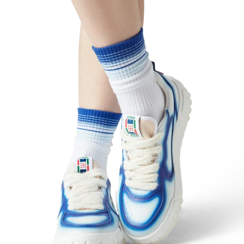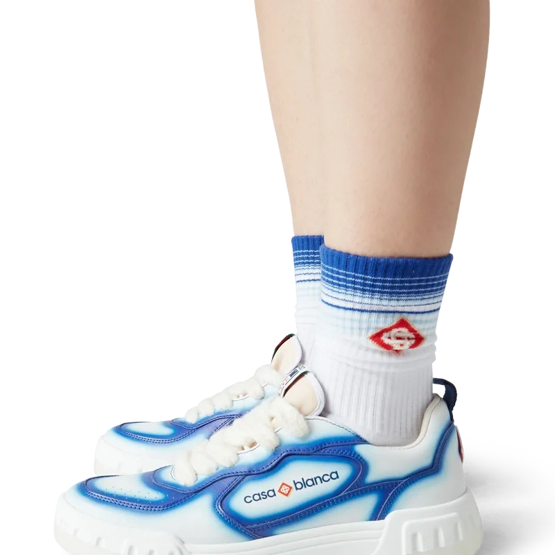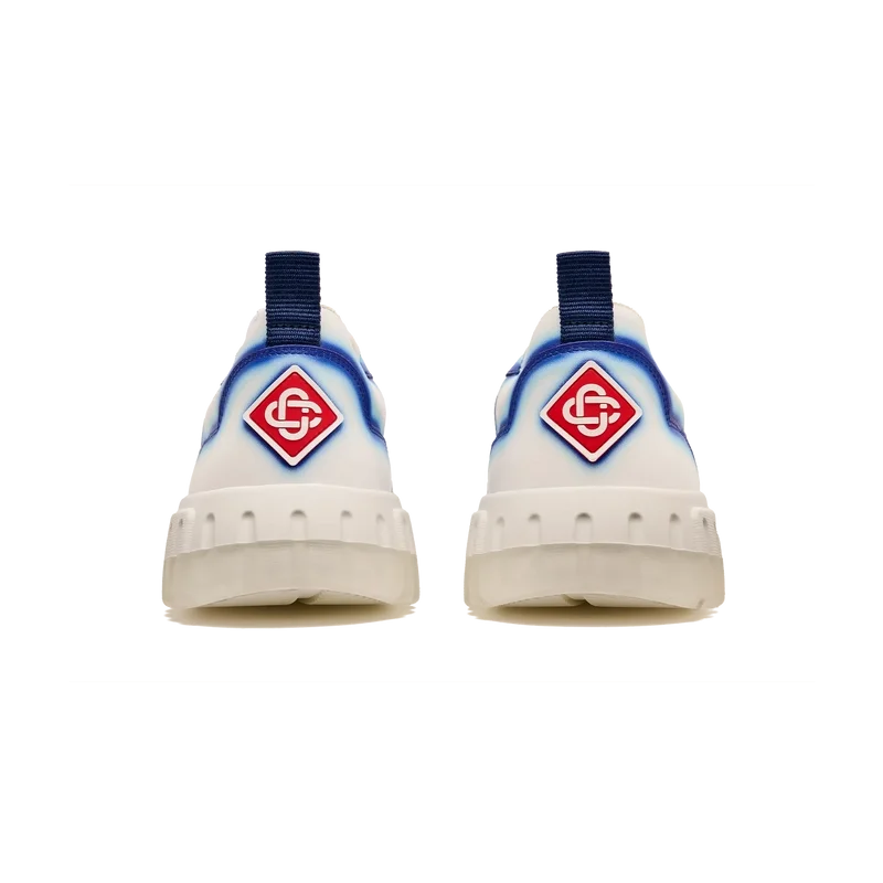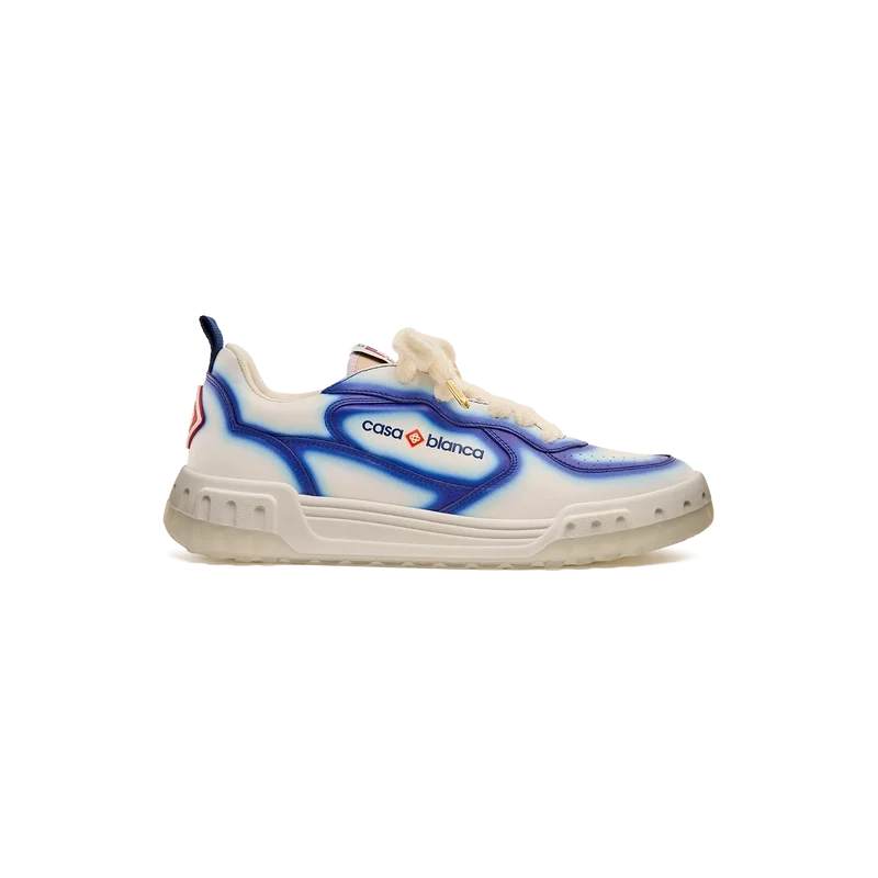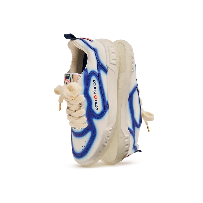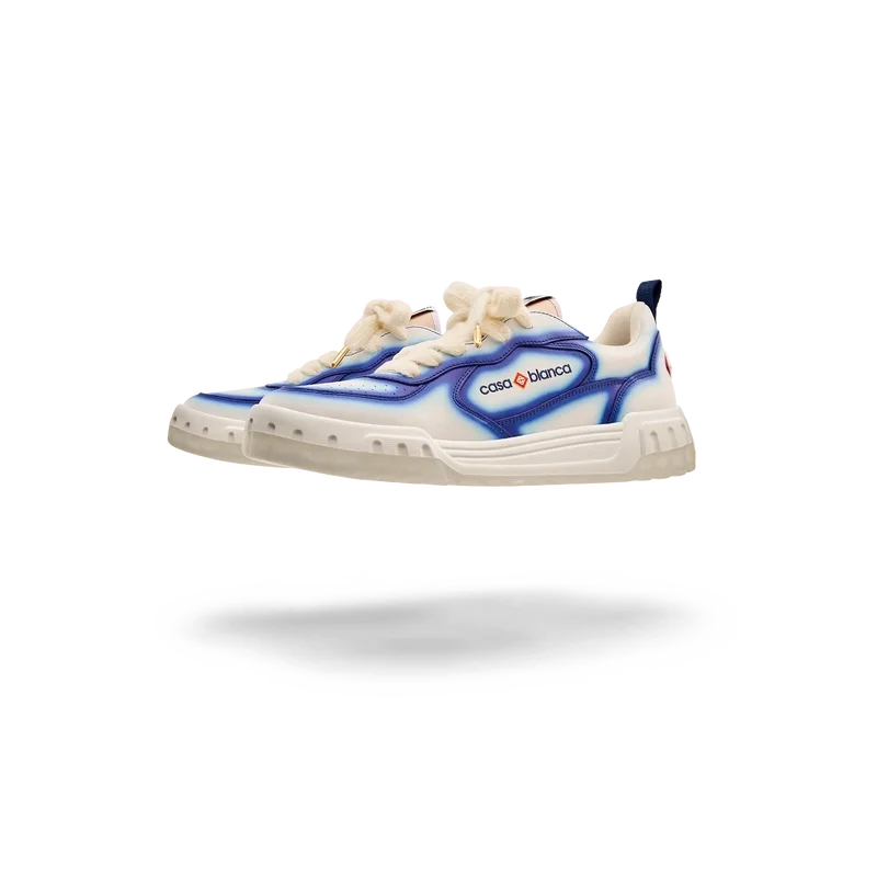 El lenguaje de diseño de las zapatillas Court refleja las siluetas icónicas de los años 90. Los colores que se aprecian en toda la suela de goma son una combinación de los códigos refinados del tenis y la arquitectura clásica, y crean una paleta unificada en toda la zapatilla, con el énfasis en los colores primarios contrastados por los blancos del tenis para crear una historia de colores con enfoque deportivo. La parte superior de los zapatos presenta líneas de paneles integradas y fluidas como un guiño a las siluetas icónicas de los años 90. La prominente marca Casablanca es evidente en todo el diseño, incluyendo el motivo de diamante característico de la marca en el talón, los paneles laterales con el logotipo de silicona y la etiqueta de la lengüeta y la plantilla con el motivo de pista de tenis tejido, lo que da origen a su nombre, la Court.