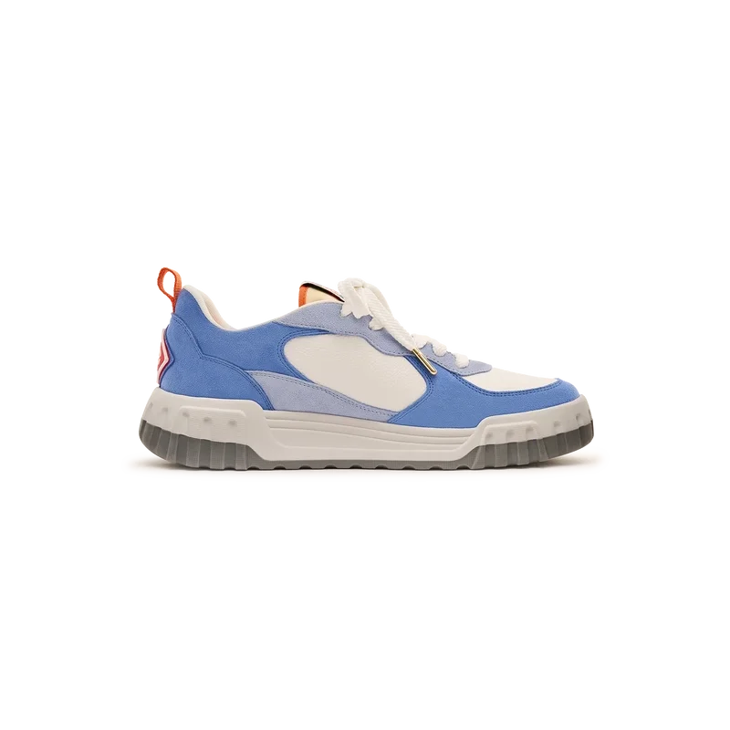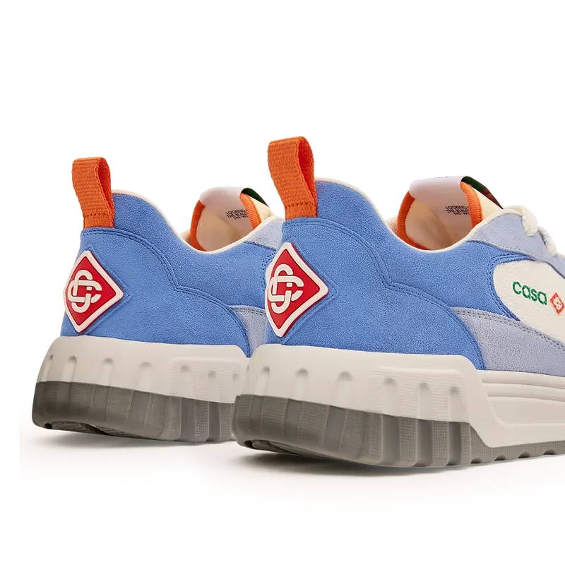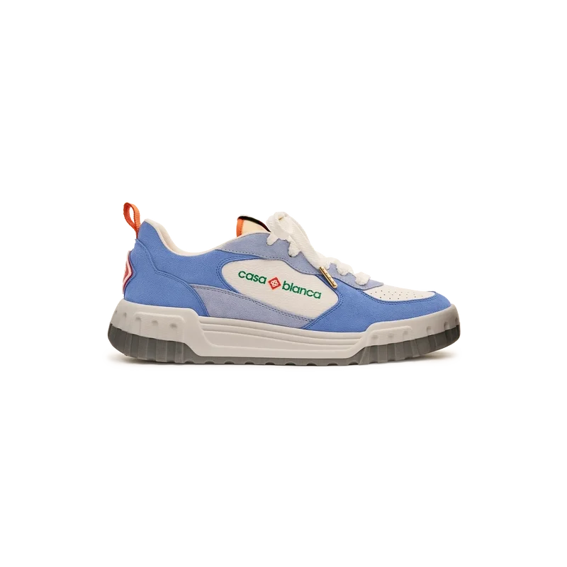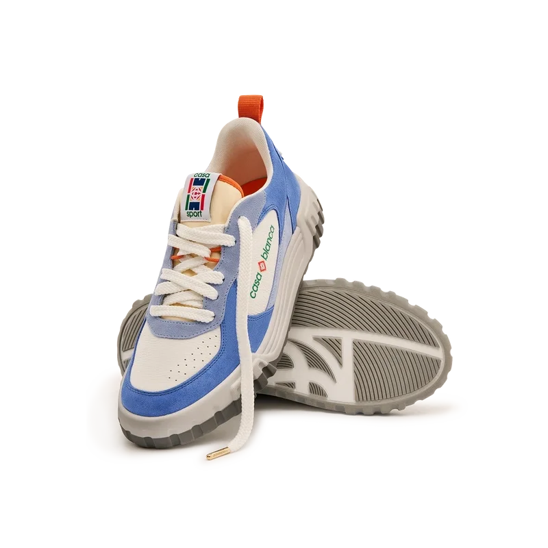 El lenguaje de diseño de las zapatillas Court refleja las siluetas icónicas de los años 90. Los colores que se aprecian en toda la suela de goma son una combinación de los códigos refinados del tenis y la arquitectura clásica, y crean una paleta unificada en todo el calzado, con el énfasis en los colores primarios contrastados por los blancos del tenis para crear una historia de colores centrada en el deporte.La parte superior de los zapatos presenta líneas de paneles integradas y fluidas como un guiño a las siluetas icónicas de los años 90. La prominente marca Casablanca es evidente en todo el calzado, incluyendo el motivo de diamante característico de la marca en el talón, el logotipo de silicona en los paneles laterales y la etiqueta de la lengüeta y la plantilla con el motivo tejido de una pista de tenis, lo que da origen a su nombre, «Court».