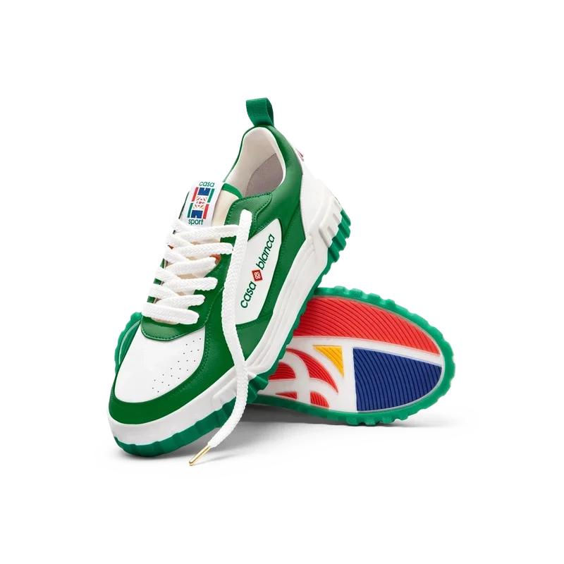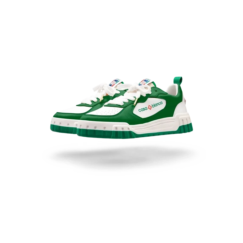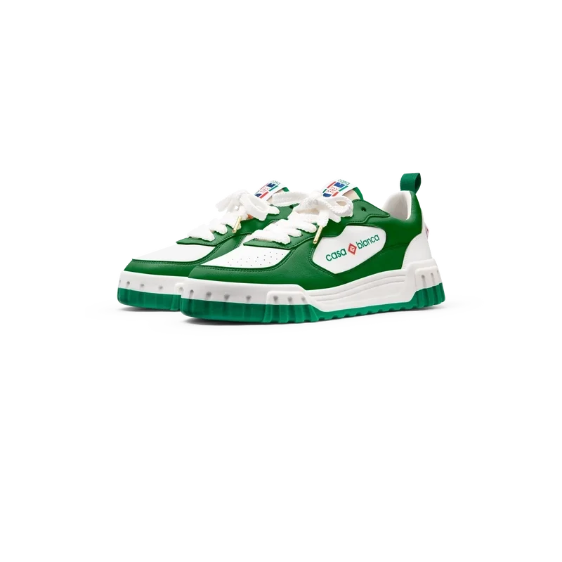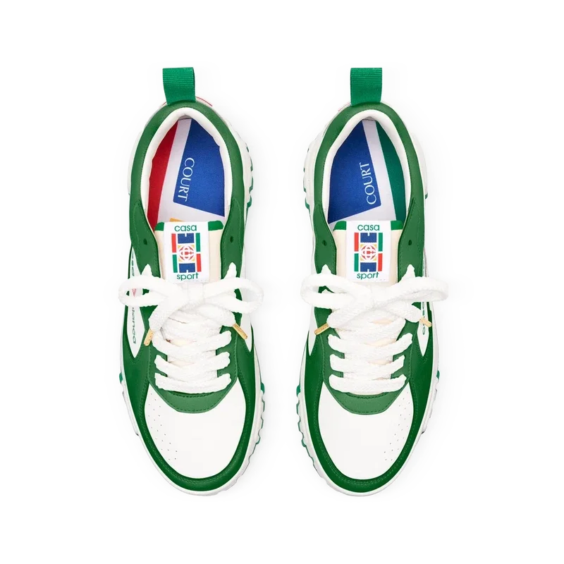La prominente marca Casablanca es evidente en todo el calzado, incluyendo el motivo de diamante característico de la marca en el talón, el logotipo de silicona en los paneles laterales y la etiqueta de la lengüeta y la plantilla con el motivo tejido de una pista de tenis, lo que da origen a su nombre, «The Court».
