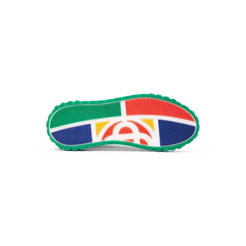 El lenguaje de diseño de la zapatilla Court Sneaker refleja las siluetas icónicas de los años 90. Los colores que se aprecian en toda la suela de goma son una combinación de los refinados códigos del tenis y la arquitectura clásica, y crean una paleta unificada en toda la zapatilla, con el énfasis puesto en los colores primarios y secundarios, contrastados por los blancos del tenis para crear una historia de colores centrada en el deporte.