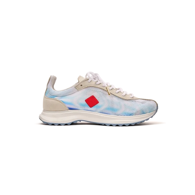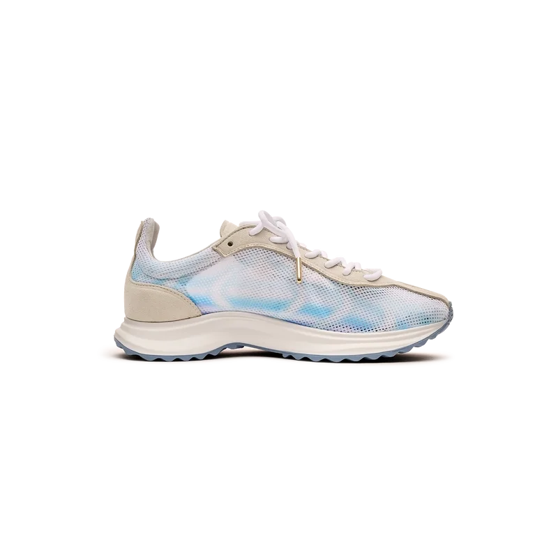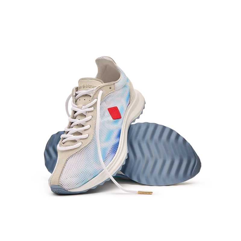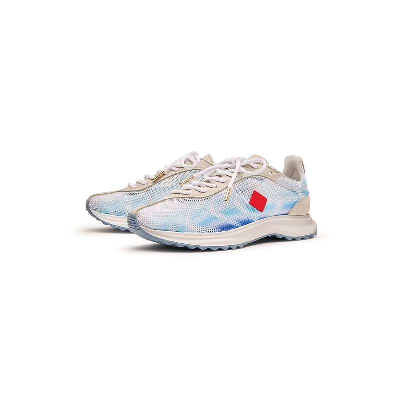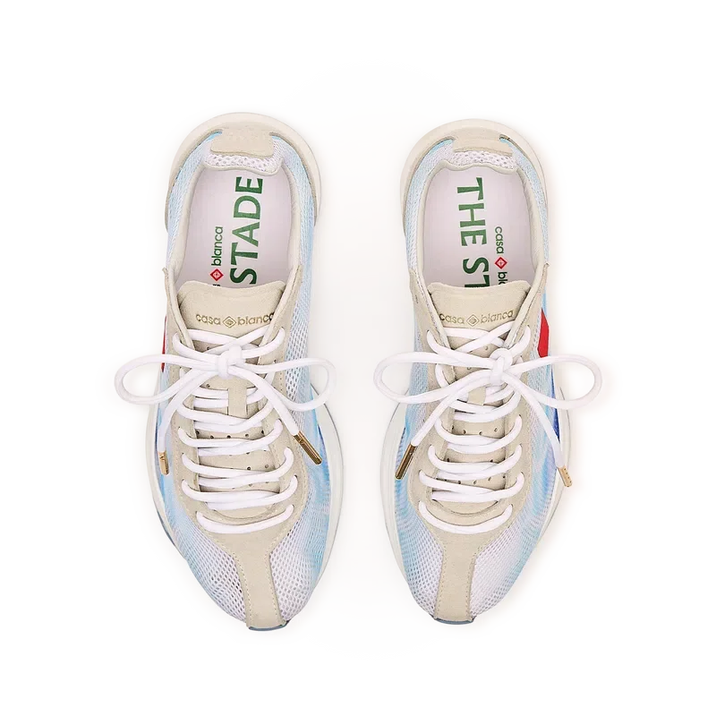 Los zapatos Stade Blue para mujer toman su nombre de la antigua medida griega de la distancia de una carrera a pie, que más tarde se convirtió en la palabra «estadio». El estilo se inspira en los zapatos de running de alto rendimiento y es una transposición de la tecnología moderna a partir de la tradición antigua; los códigos del running moderno, con la malla ligera y el estampado brillante, aportan modernidad. La suela presenta curvas esculpidas, en referencia a nuestro modelo Atlantis y un diseño característico de Casablanca.