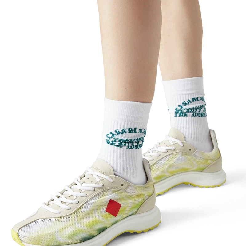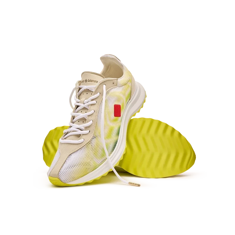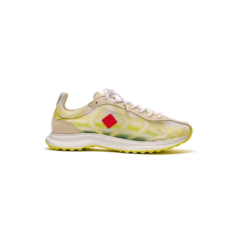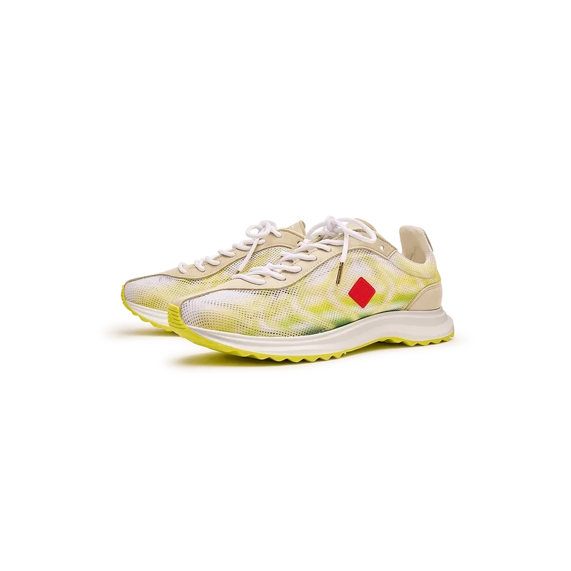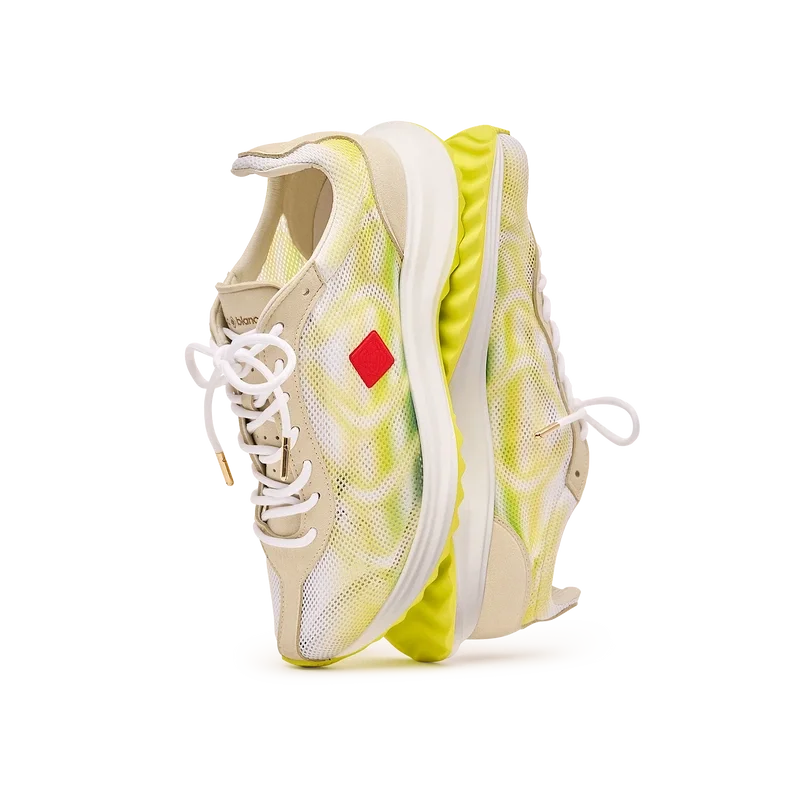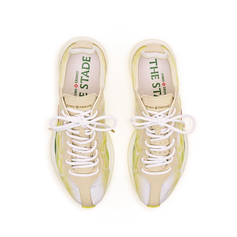 Los zapatos Stade Green para mujer toman su nombre de la antigua medida griega de la distancia de una carrera a pie, que más tarde se convirtió en la palabra «estadio». El estilo se inspira en los zapatos de running de alto rendimiento y supone una transferencia de la tecnología moderna a la tradición antigua; los códigos del running moderno, con la malla ligera y el estampado brillante, aportan un toque de modernidad. La suela presenta curvas esculpidas, en referencia a nuestro modelo Atlantis y un diseño característico de Casablanca.