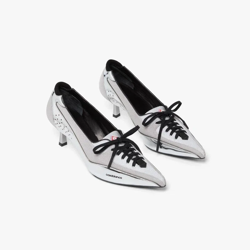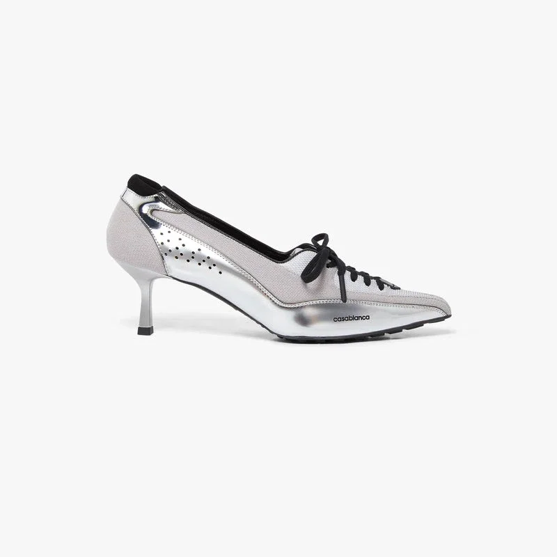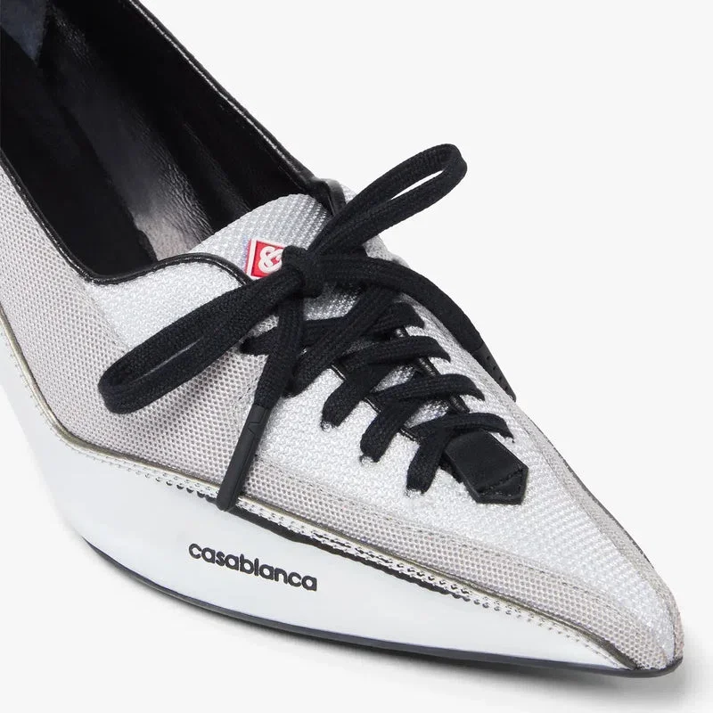 Los zapatos de tacón tipo sneaker de piel plateada presentan un diseño refinado, con una innovadora fusión de las siluetas de las zapatillas y los zapatos de tacón. Cuentan con cierre de cordones, parte superior de piel y tejido, y un elegante tacón bajo que encarna el enfoque sofisticado de la casa en el calzado contemporáneo.